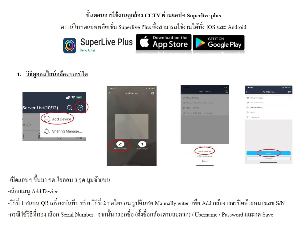 ขั้นตอนการติดตั้งและเข้าสู่ระบบ 1. ดาวน์โหลดและติดตั้งแอป SuperLive Plus • iOS: ผ่าน App Store • Android: ผ่าน Google Play Store 1. เปิดแอป เลือก Add Device (เพิ่มอุปกรณ์) 2. กรอกข้อมูลอุปกรณ์ที่ต้องการเชื่อมต่อ เช่น • ชื่ออุปกรณ์ (Name) – ตั้งชื่ออะไรก็ได้เพื่อจำง่าย • โหมดเชื่อมต่อ (Login Type) • โดยทั่วไปเลือก IP/Domain หรือ Serial Number (SN) • ที่อยู่ (Address / IP / Domain / SN) – ป้อน IP หรือหมายเลขเครื่อง DVR/NVR • Port – ค่าเริ่มต้นมักเป็น 37777 (ขึ้นอยู่กับรุ่น) • User / Password – บัญชีผู้ใช้งานที่ตั้งไว้ใน DVR/NVR 1. กด Save/OK เพื่อบันทึก ________________________________________ ขั้นตอนการดูภาพสด (Live View) 1. ไปที่เมนู Live View 2. เลือกอุปกรณ์หรือกล้องที่ต้องการ 3. กดที่ชื่อกล้อง → ภาพจากกล้องจะแสดงบนหน้าจอ • สามารถเลือกหลายกล้องพร้อมกันได้ (2, 4, 8, 16 ช่อง ขึ้นอยู่กับเครื่อง) ________________________________________ ขั้นตอนการดูย้อนหลัง (Playback) 1. ไปที่เมนู Playback 2. เลือกอุปกรณ์และช่องกล้องที่ต้องการ 3. เลือก วันที่และเวลาที่ต้องการ 4. กด Search → ระบบจะแสดงไฟล์บันทึกที่มี 5. กดเล่น (▶) เพื่อดูย้อนหลัง • สามารถเลื่อนเวลา หยุดชั่วคราว หรือกรอไปข้างหน้าได้ ________________________________________ เคล็ดลับเพิ่มเติม • หากใช้งาน ผ่านอินเทอร์เน็ตภายนอก (ดูนอกสถานที่) • ต้องตั้งค่า Port Forwarding / DDNS / P2P (SN) ให้เรียบร้อยในเครื่อง DVR/NVR • หากลืมรหัสผ่าน ต้องรีเซ็ตหรือติดต่อผู้ติดตั้งเพื่อปลดล็อก • ตรวจสอบให้แน่ใจว่า มือถือเชื่อมต่ออินเทอร์เน็ต (WiFi/4G/5G) และเครื่องบันทึกเปิดใช้งานอยู่ตลอดเวลา